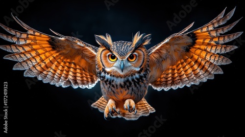 A dramatic portrait of an owl with wings raised, showcasing power and elegance