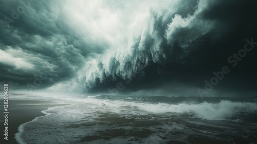 A dramatic seascape showcasing towering waves and dark, stormy skies, creating a powerful and intense atmospheric scene.