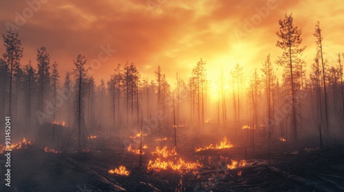 A dramatic sunset enveloping a forest fire, showcasing the beauty and devastation of nature in a captivating display.