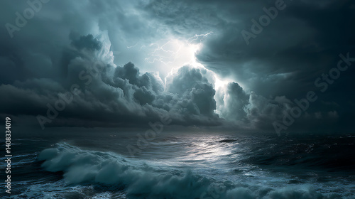 A dramatic thunderstorm over a vast ocean, with dark clouds, lightning striking the water, and the waves crashing against the shore