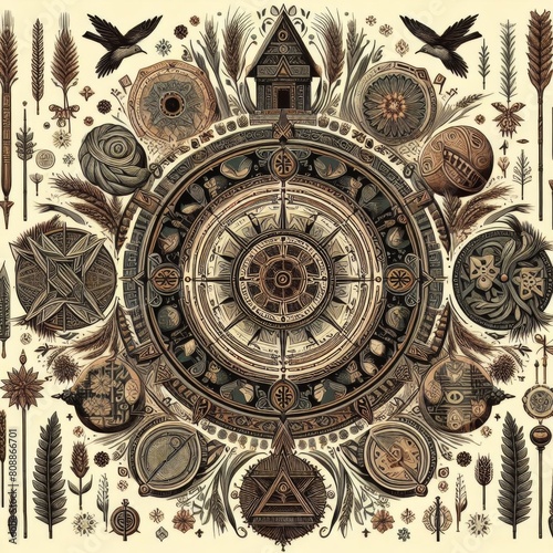 a drawing of a circle with birds and a clock with the word quot all quot on it