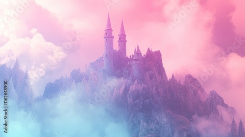 A dreamy castle perched on a mountain, surrounded by soft pastel clouds.