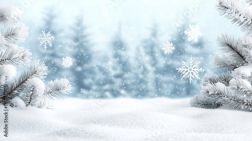 A dreamy scene of small snowflakes tumbling in slow motion through a wintry landscape, their intricate forms sparkling subtly against the blurred outlines of distant, snow-covered