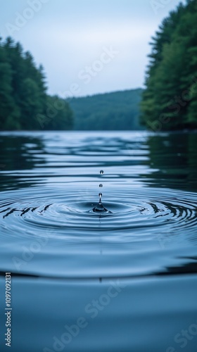 A droplet falls into still water, creating ripples in a serene lake at dusk.