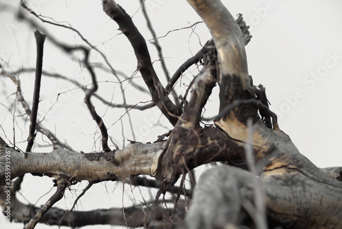 A dry tree branch against a bright sky. Large inverted tree roots against sky. A branch of an old dried tree against the sky. Texture closeup. Many dark roots, The big tree roots that look mysterious.