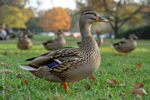 A duck is seen standing on grass with autumn foliage in the background, captured within a park setting