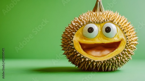 A durian with funny cartoon eyes and a quirky grin on a bright green background