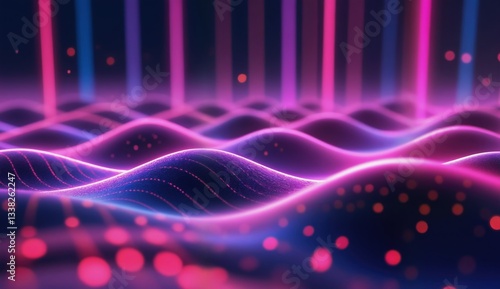 A dynamic, abstract digital landscape featuring undulating waves of dark, textured material illuminated by vibrant neon lines in pink and cyan.