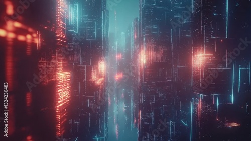 A dynamic, high-tech blue and metallic abstract composition featuring futuristic geometric structures.