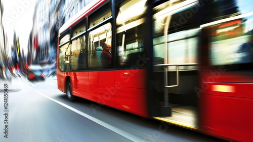 A dynamic shot of a red bus speeding through a vibrant cityscape, capturing the essence of urban transportation.