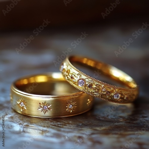 A elegant with detailed floral motifs etched along its band, presenting a delicate and sophisticated piece of jewelry art with a reflective surface.