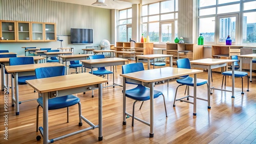 A emptied classroom with desks and chairs spaced apart, surrounded by scattered disinfectant wipes and spray bottles, conveying a sense of cleanliness and precaution.