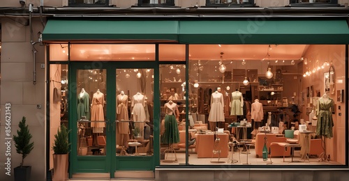A European Green Vintage Boutique Storefront with a Sleek Modern Glass. Traveling concepts