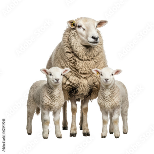 A ewe with her two young lambs standing side by side. This image captures the bond within a sheep family, ideal for agricultural or animal related themes.
