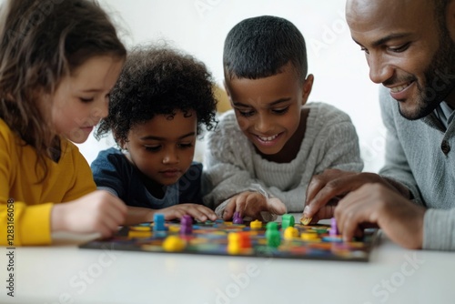 A family moment - father and his two young children enjoying a fun evening together, playing a board game
