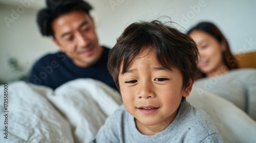 A family of three, a young boy and two adults, posing together in a bedroom.