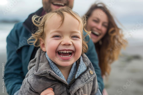 A family of three is smiling and laughing together on a beach