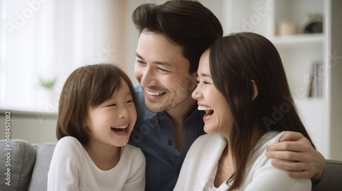 A family of three smiling at each other.