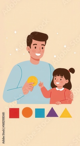 A father and daughter engage in a playful learning activity, pointing to a circle shape.