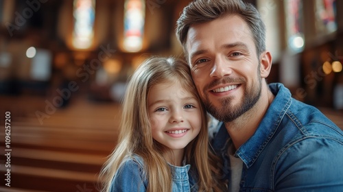 A father and his daughter sit closely together, smiling joyfully in a church with beautiful stained glass windows. Their happiness radiates in the serene atmosphere