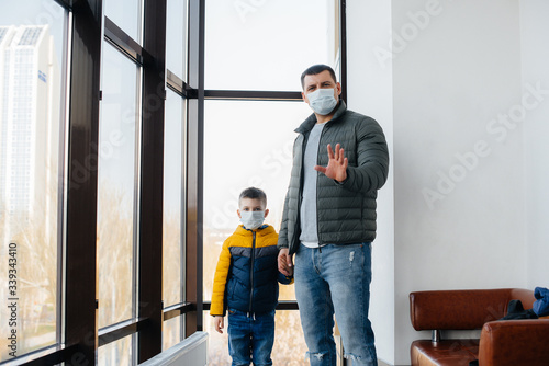 A father with his child stands in a mask during the quarantine. Pandemic, coronavirus