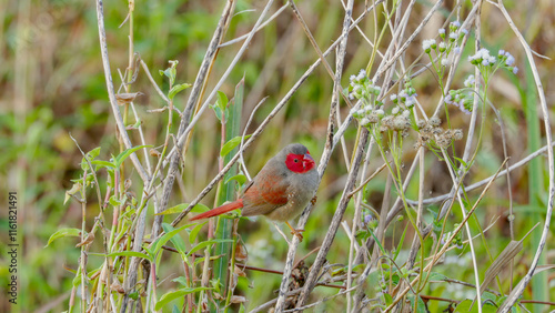 a female crimson finch perching on the stem of a shrub at tyro wetlands at ingham of qld, australia