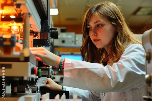 A female scientist in a lab coat conducting an experiment with focused concentration.