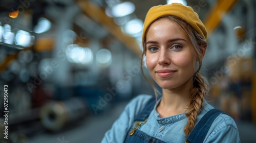 A female worker stands in a workshop against an industrial background.