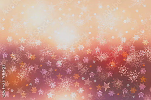 A festive abstract delicate Happy New Year or Christmas background texture with colorful gold yellow pink blurred bokeh lights and stars. Space for design. Card concept or advertising.