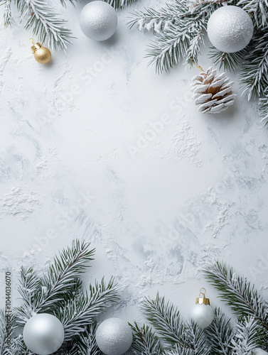 A festive and inviting winter scene featuring snow-covered pine branches, shimmering silver ornaments,