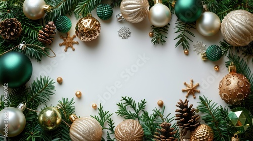 A festive arrangement of Christmas ornaments and pine branches on a white background.