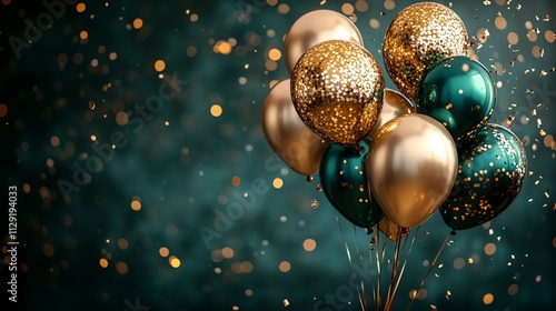 A festive arrangement of gold and emerald green balloons on a deep emerald background with shimmering gold confetti, ideal for New Year's or anniversary celebrations.