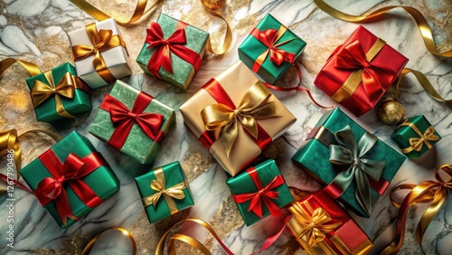 A festive arrangement of wrapped gifts with satin ribbons, bows, and gold accents on a marble surface.