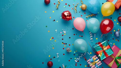 a festive arrangement with colorful balloons, confetti, and wrapped gift boxes on a blue background. The items are clustered towards the right side