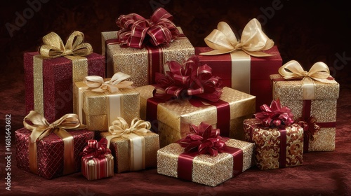 a festive array of luxurious christmas presents in various sizes wrapped in shimmering gold and deep red papers each box is adorned with elegant ribbons and bows arranged artfully on a velvet backd