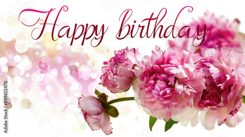 A festive birthday greeting card featuring pink peonies and a bokeh background
