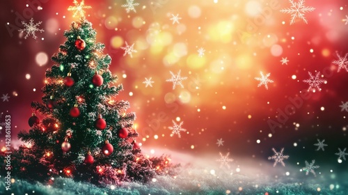 A festive Christmas banner with snowflakes, a decorated Christmas tree, and warm red and green colors.