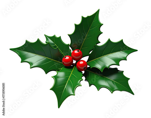 A festive Christmas holly sprig with glossy green leaves and red berries.