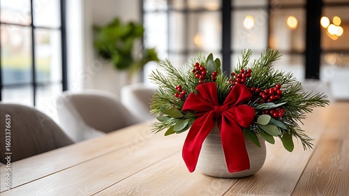 A festive Christmas table centerpiece featuring a lush arrangement of red poinsettias, evergreen foliage, berries, and decorative branches, showcasing holiday cheer and warmth.