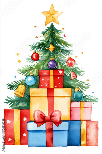 A Festive Christmas tree is adorned with gifts, decorations and a bright star, embodying the spirit of the holiday season. A joyous display, inviting warmth and cheer.