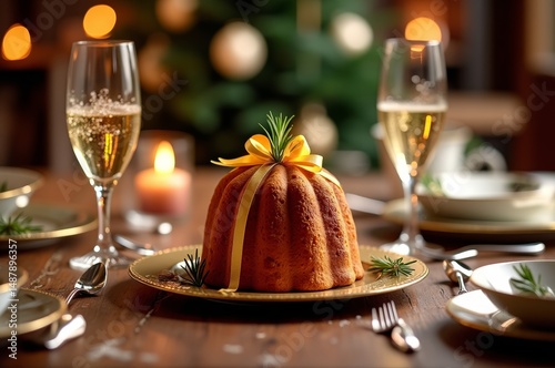 A festive dessert with yellow bow on a table set for Christmas dinner