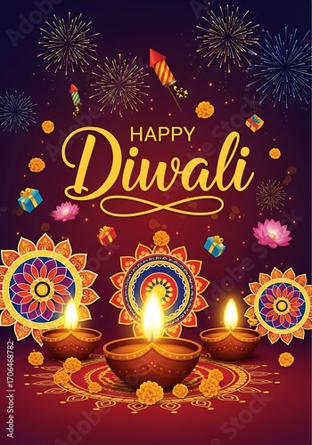 A Festive Diwali Celebration Illuminated with Earthen Lamps, Vibrant Fireworks, and Auspicious Decorations that Creates a Harmonious and Joyful Atmosphere