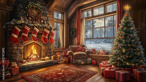 A festive family room with stockings hanging by the fire, a Christmas tree, and gifts ready for opening.