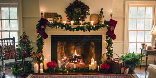 A festive fireplace mantel adorned with Christmas garlands, stockings, and candles, with a wreath hanging above and a warm fire burning in the hearth.