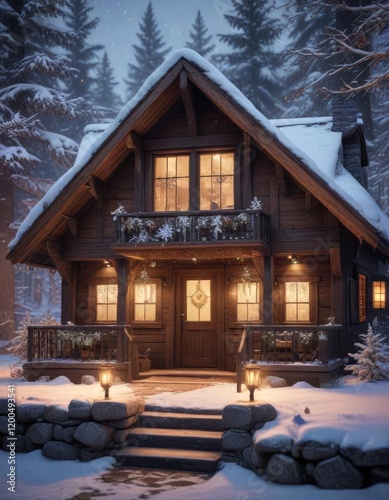 A festive holiday cabin with snowflakes and decorations, holiday cheer, warm glow