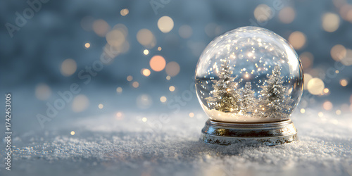 A festive snow globe filled with miniature pine trees and sparkling snow, resting on a snowy surface with soft bokeh lights