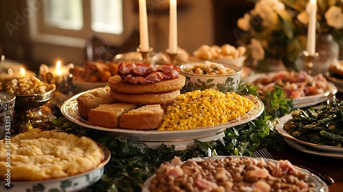 A festive Southern New Year celebration table with black-eyed peas, cornbread stacked high on a platter, and collard greens garnished with bacon,