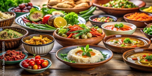 A Festive Spread of Middle Eastern Dishes A Variety of Bowls Filled with Delicious Food on a Rustic Wooden Table, Middle Eastern Cuisine, Food Photography.