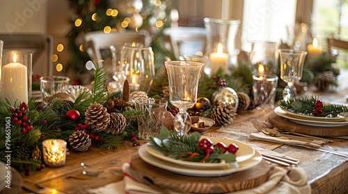 A festive table setting for a holiday meal, with a focus on the communal joy and seasonal decorations.