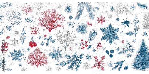 A festive winter design, featuring intricate patterns of plants, snowflakes, and botanical elements in shades of blue, red, and gray, arranged on a textured white background.